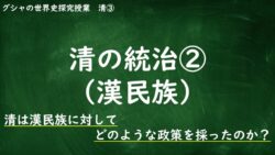 10-3.清 [10-3.3]清の統治②(漢民族) はじめにグシャケン前回はこのような内容でした。グシャケン今回は清の漢民族に対する統治についてです。漢民族社会に対して、清はどんな政策をおこなったんでしょうか。それでは一緒にみていきましょう!MQ:清は漢民族に対してどのような政策を採ったのか... 2025.10.15 10-3.清