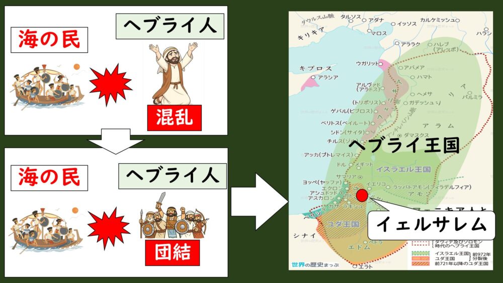 この「強い指導者」が王となり、前11世紀末にヘブライ王国が誕生するんです。