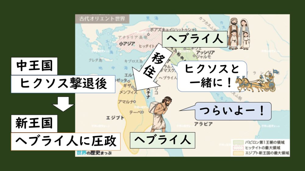 そのころ、シリア・パレスチナではヒクソスがエジプト中王国に侵入していた時代であり、ヘブライ人の一部はヒクソスと一緒にエジプトに移住します。