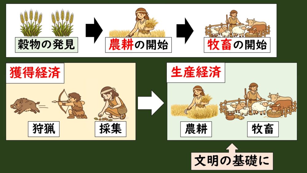 そして人類史は狩猟採集による「獲得経済」から、農耕・牧畜による「生産経済」へと大きく変革をとげていきます。