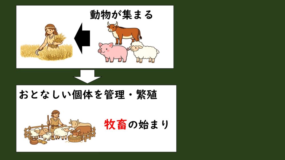 穀物を発見 → 食物栽培の開始(農耕) → それに群がってくる野生動物 → おとなしい個体を管理・飼育(牧畜)