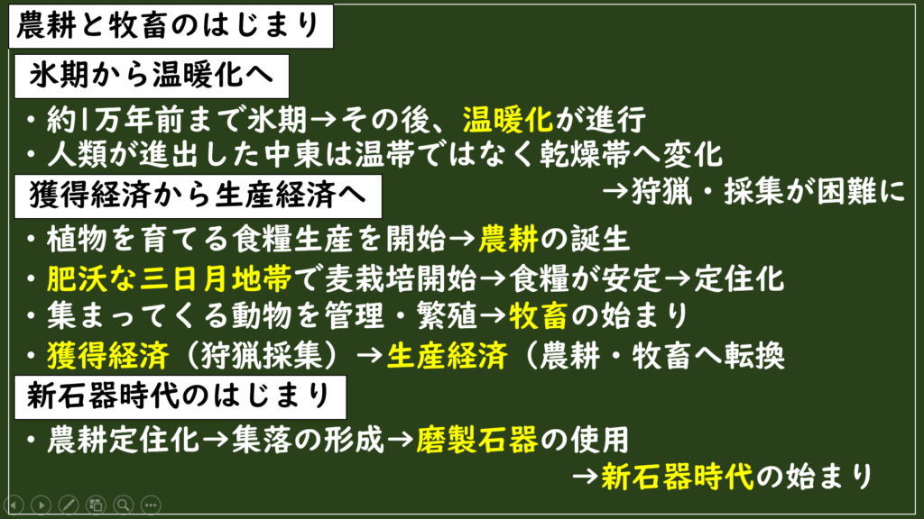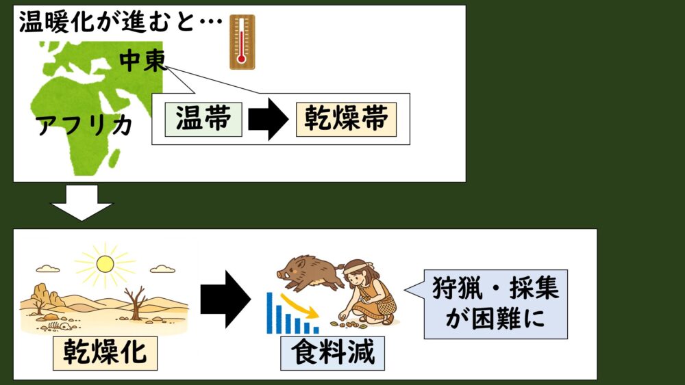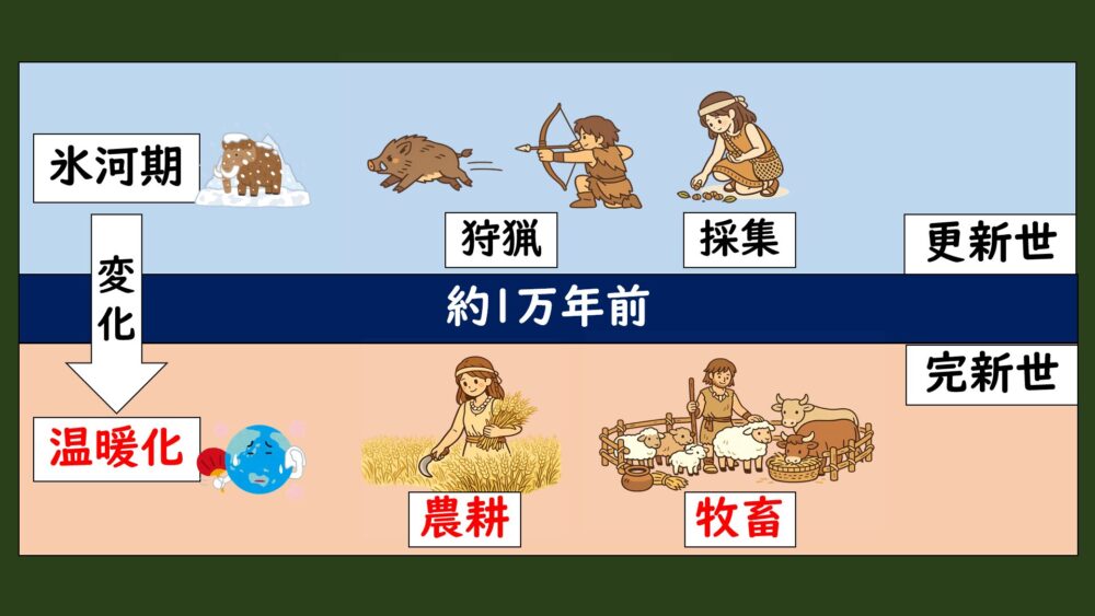 「農耕・牧畜」がどのような環境変化からできたのかというと、それはずばり温暖化です。