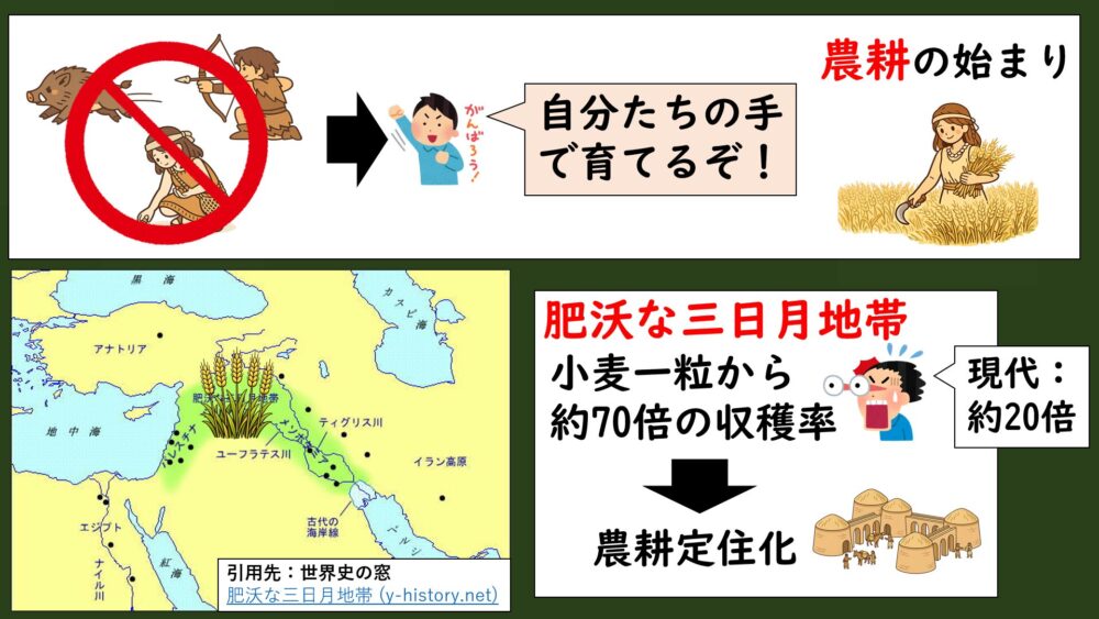 具体的には、約9000年前に中東の「肥沃な三日月地帯」で麦の栽培が始まりました。