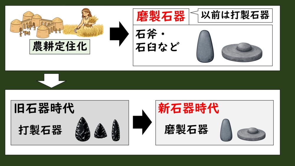 打製石器による旧石器時代 → 磨製石器による「新石器時代」の始まりです。