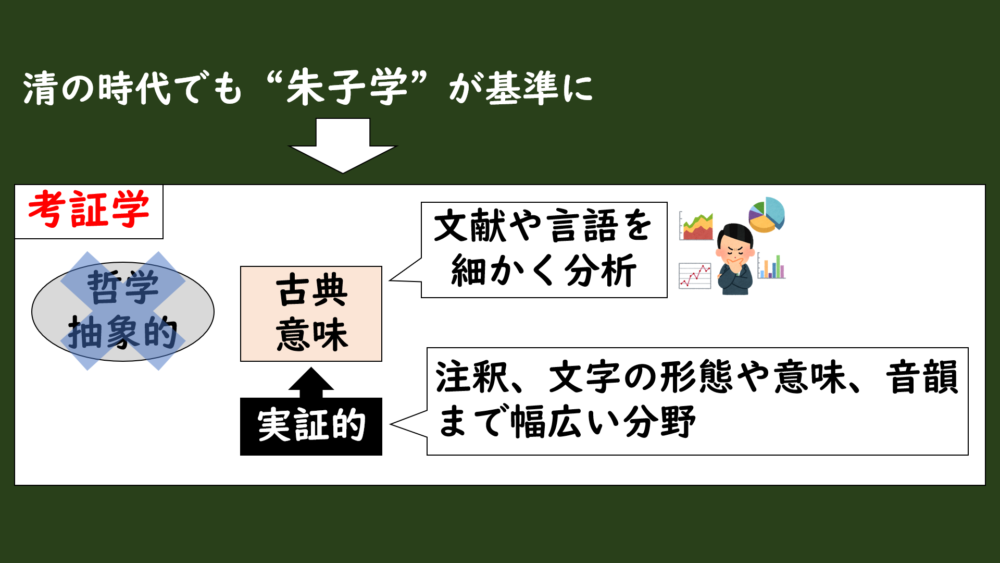 考証学とは、宋から明にかけて流行した哲学的な考え方で、「宇宙の根元」のような抽象的なものを追求するのではなく、文献や言語を細かく分析して、古典の当時の意味をちゃんと確かめて(実証的)、明らかにしようとした学問でした。
