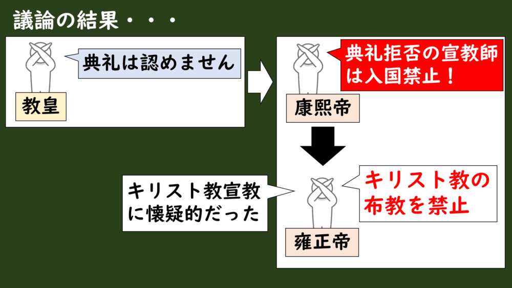 そして議論の結果、教皇は中国の先祖崇拝や儀礼(典礼)を認めるイエズス会の布教方法を禁止してしまいます。
