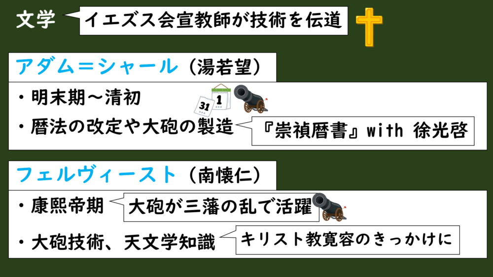 ドイツ出身のアダム=シャール(湯若望)は、明末期から清にかけて中国を訪問して、暦法の改定や大砲の製造などに携わりました。