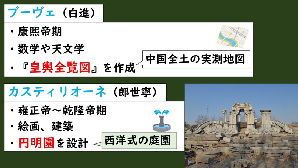 特に幾何学や測量技術に優れていて、康熙帝の命で中国の実測地図である『皇輿全覧図(こうよぜんらんず)』の作成にも関わりました。