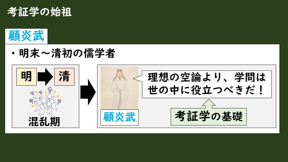 この考証学は明末から清の初めに生きた顧炎武(こえんぶ)という儒学者が始めた学問だといわれています。