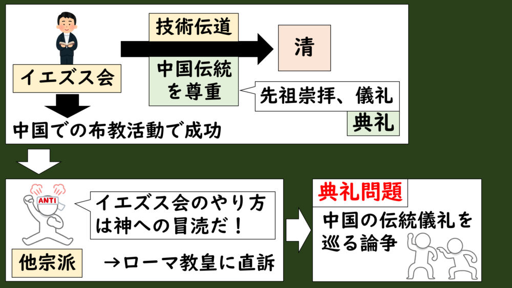 とイエズス会を批判してローマ教皇に訴えたことから、典礼問題としてローマ=カトリック教会内や清との間で問題になってしまいます。