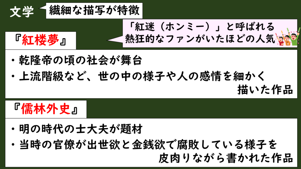 文学では『紅楼夢』(こうろうむ)という長編小説で、乾隆帝の頃の社会を舞台に上流階級などの世の中の様子や人の感情を細かく描き、とても人気があった作品でした。
