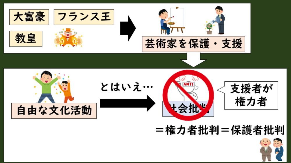 「社会批判=権力者批判=保護者批判」になっちゃいますからね。芸術活動のスポンサーには悪いことが言えなかったんです。