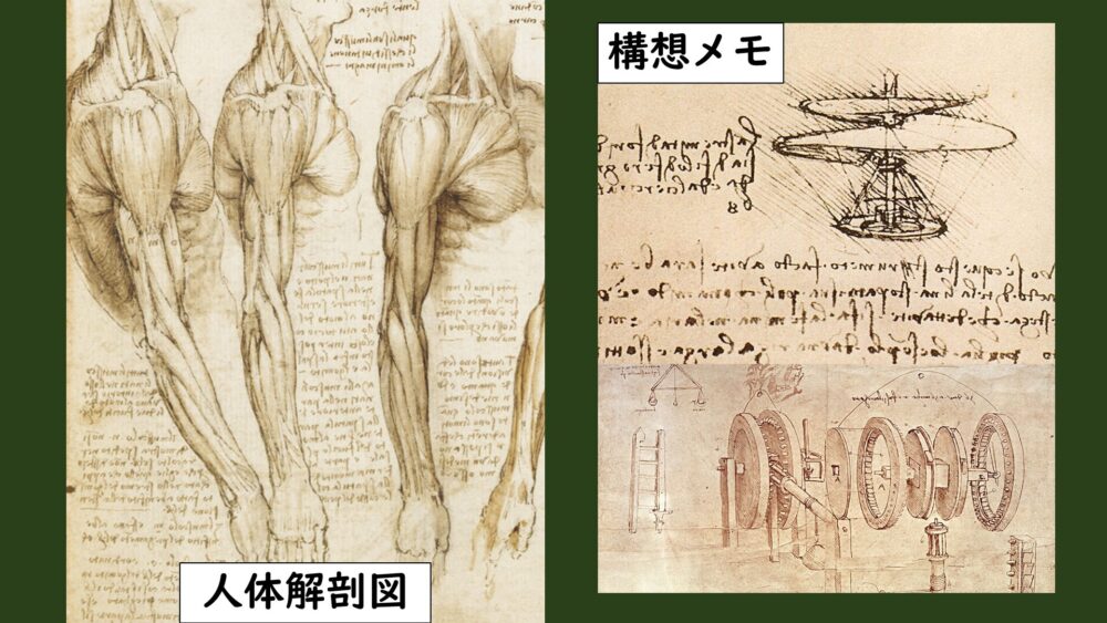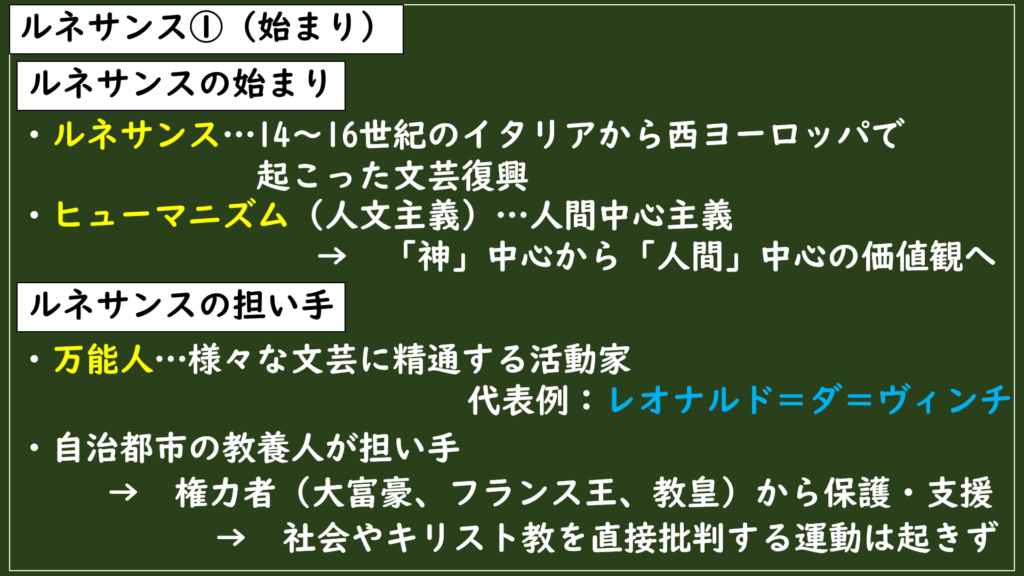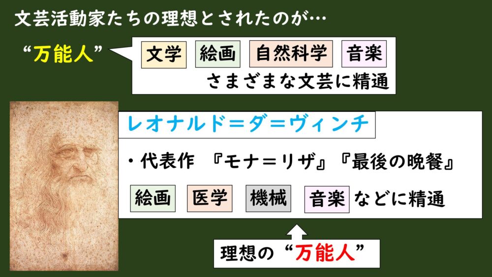 代表的な人物としては「モナ=リザ」や「最後の晩餐」で有名なレオナルド=ダ=ヴィンチで、彼は絵画だけではなく、医学や機械、音楽に精通していた万能人が理想とされました。