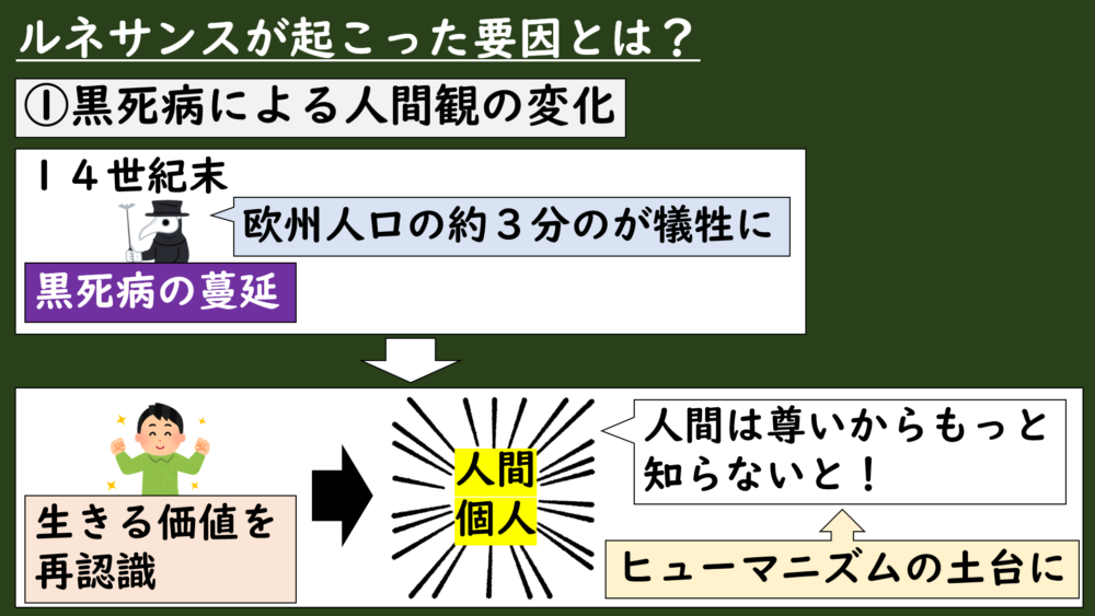 黒死病による人間観の変化、ローマ=カトリック教会の権威の低下、イスラーム圏からの学問の流入、そして東方貿易と都市の繁栄による文化支援の4つが重なり、「神中心」から「人間中心」への価値観の転換が起こり、古典復興による芸術や学問が大きく花開くルネサンスが起こった。