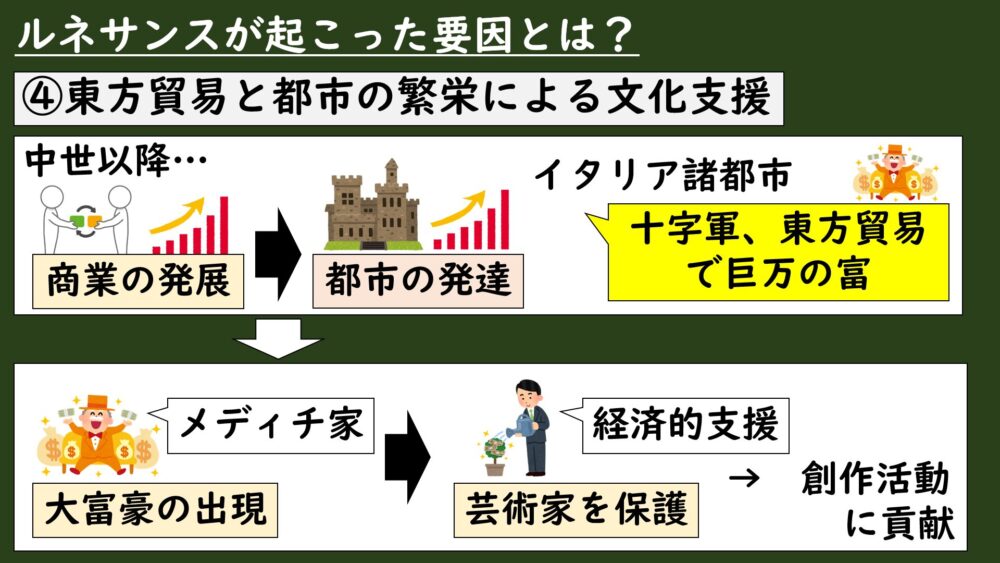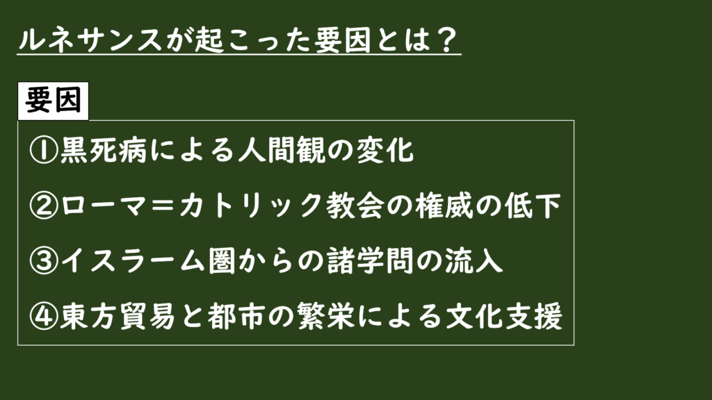 以上の「①黒死病による人間観の変化」、「②ローマ=カトリック教会の権威の低下」、「③イスラーム圏からの諸学問の流入」、「④東方貿易と都市の繁栄による文化支援」を要因として、ヨーロッパでルネサンスが始まったと考えられます。