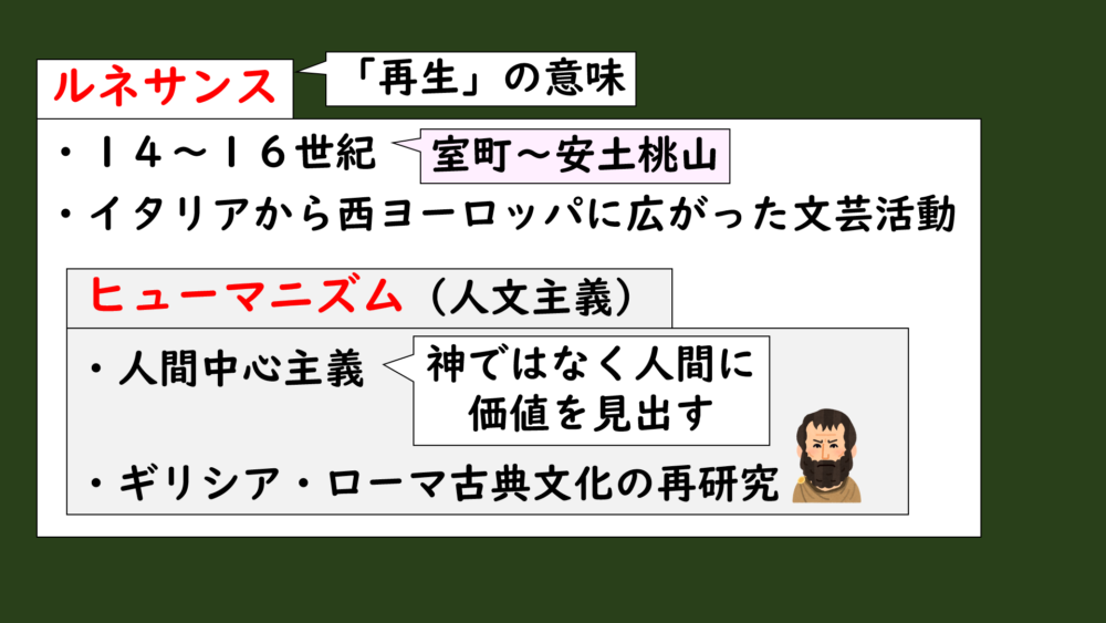 ルネサンスは特にギリシアやローマの古典文化を蘇らせようという運動で、ヒューマニズム(人文主義)という人間中心主義がテーマになっていました。