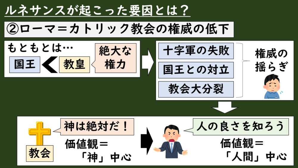 そして同時期に起こったのが、ローマ=カトリック教会の権威が低下したことでした。