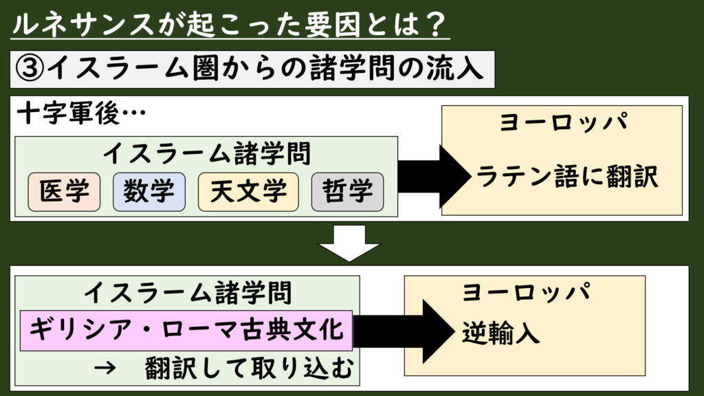 十字軍や交易を通じて、イスラーム世界の高度な学問(医学、数学、天文学、哲学など)がラテン語に翻訳されてヨーロッパに流れ込んできたんです。