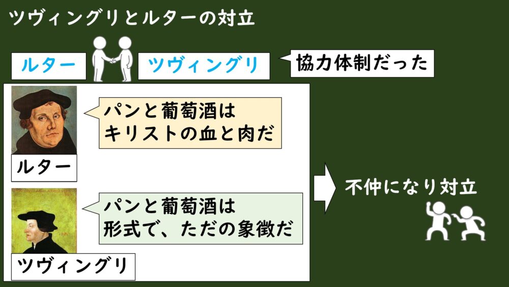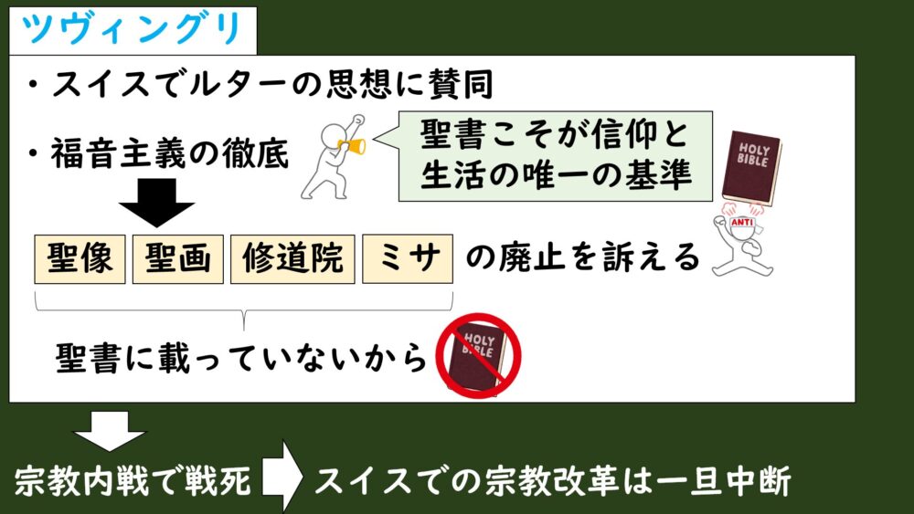 ツヴィングリはルターの教会批判に影響を受けて、福音主義に基づく信仰を徹底しようと主張しました。