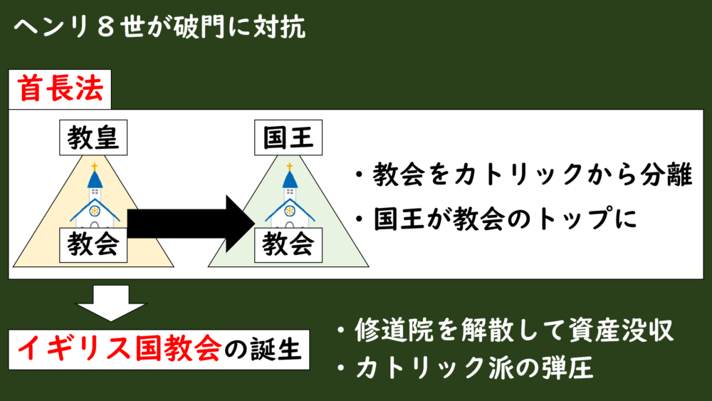 ヘンリ8世はカトリック教会に対抗するために、議会の承認を得て首長法という法律を制定します。