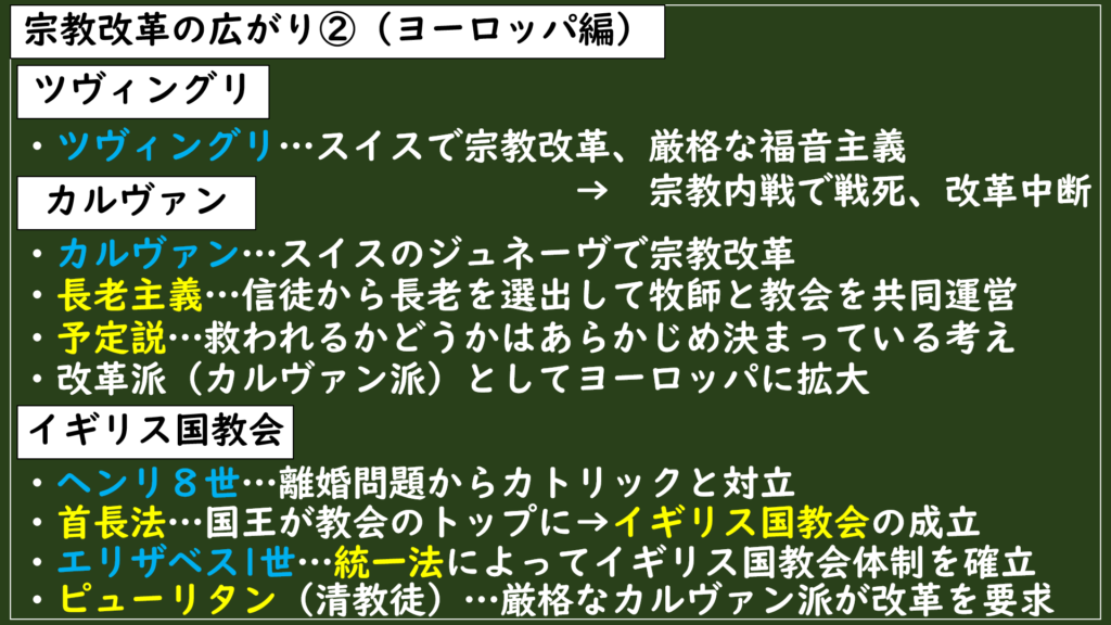 スイスのジュネーヴに逃れたカルヴァンは、そこでもツヴィングリの影響を受けて、宗教改革を推し進めていくことになりました。