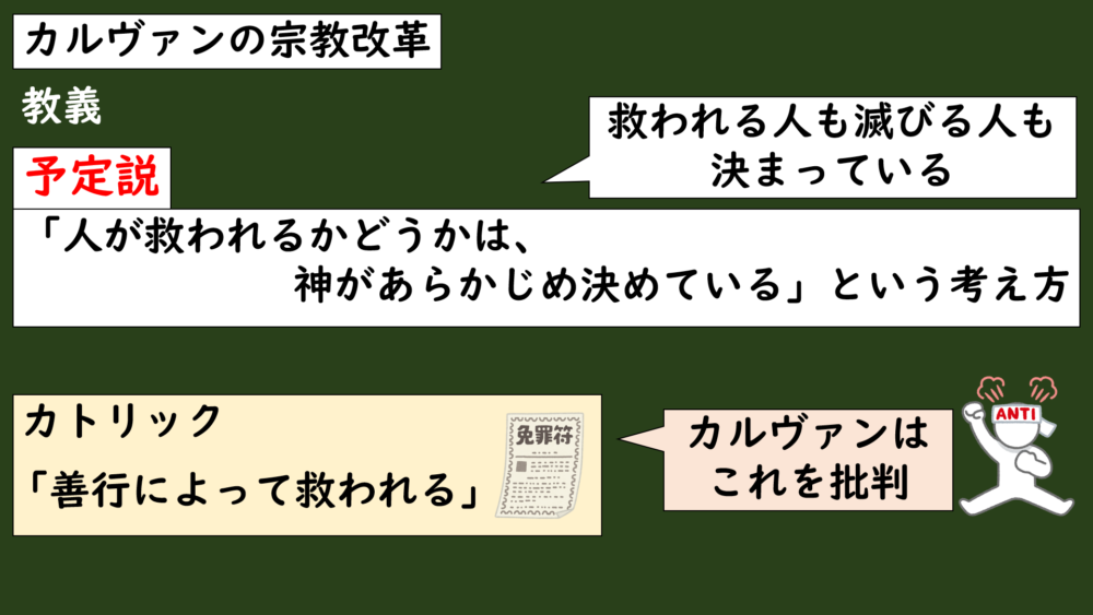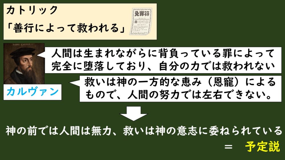 カトリック教会は「贖宥状」などを通じて「善行によって救われる」と教えられていましたが、カルヴァンはそれを批判して、こう考えました。