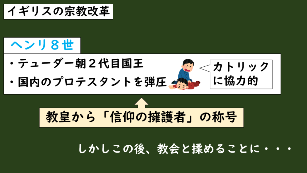 この時、ヘンリ8世は教皇から「信仰の擁護者」という称号をもらうほどカトリック教会に協力的だったんですよ。
