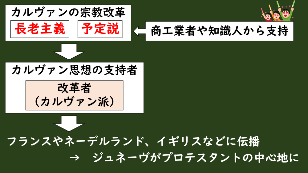 こうしたカルヴァンの教会制度(長老主義)や教義(予定説)は、商工業者や知識人の間で支持されるようになり、カルヴァンの教えを支持するプロテスタントを「改革派(カルヴァン派)」と呼ぶようになりました。