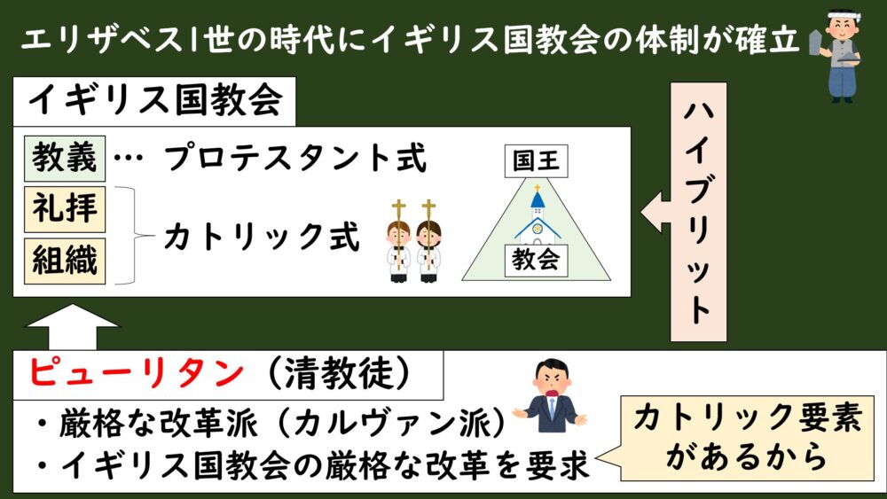 しかし、カトリック要素が残ったイギリス国教会を良く思っていなかった改革派(カルヴァン派)のプロテスタントたちは、厳格な改革を求めるようになります。