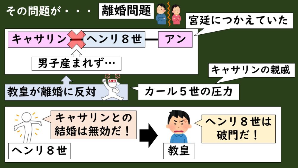 イギリスでも宗教改革がおこることになりますが、改革をおこなったのが国王ヘンリ8世で、なんと離婚問題から始まった変わった改革だったんです。