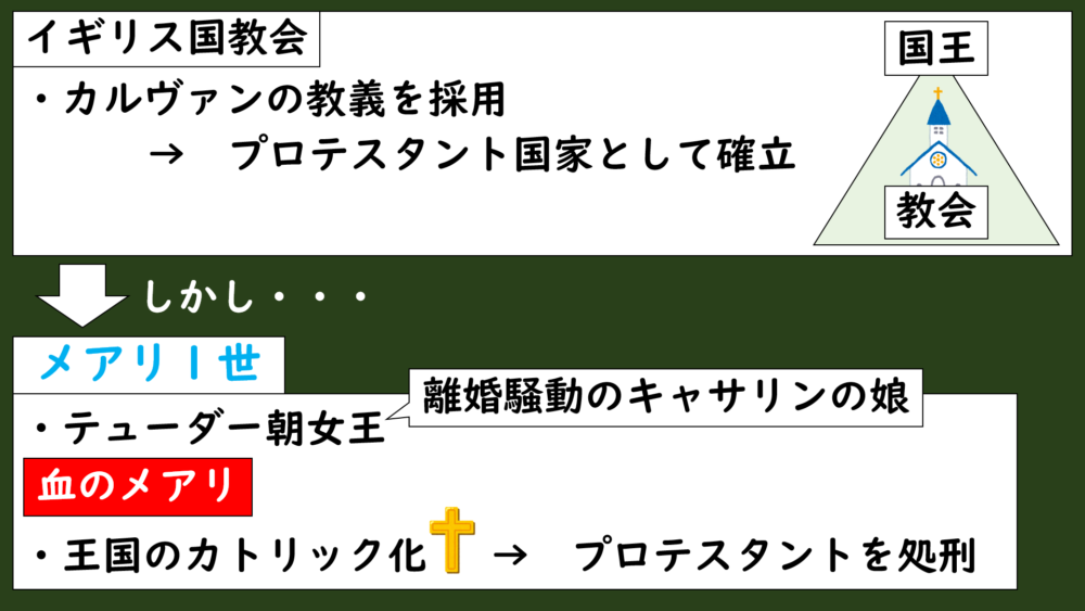 しかし、メアリ1世が女王に就任した際に、カトリック教会に戻そうとして、プロテスタントの聖職者数百人が処刑されるなど、プロテスタントへの弾圧がおこなわれたりもしました。