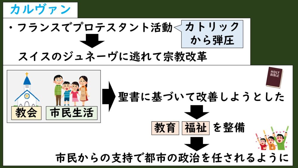 カルヴァンは、教会だけでなく市民の生活も聖書に基づいて改善しようと活動し、理想の都市を創ろうとしました。