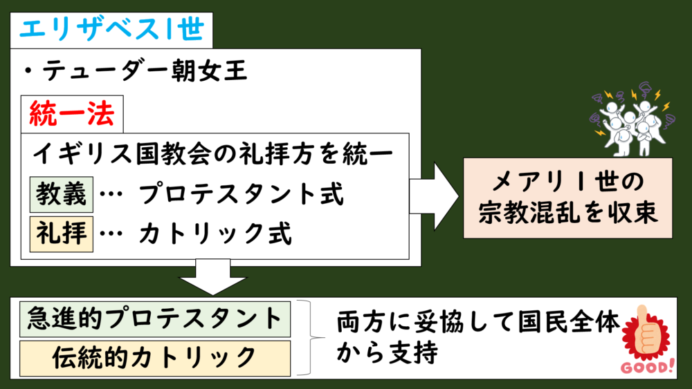 なので、エリザベス1世はこの対立を和らげて、王国の治安や王権を安定させる必要があったんです。