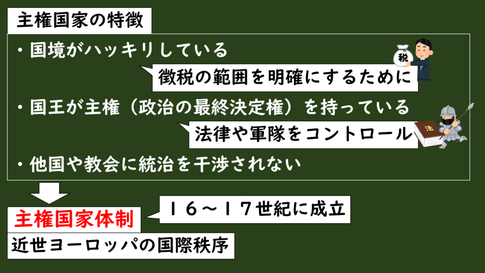 日本では主権は「国民全員」が持っていますが、近世ヨーロッパの主権国家では主権は「国王」のみが持っていたことに注意しておきましょう。