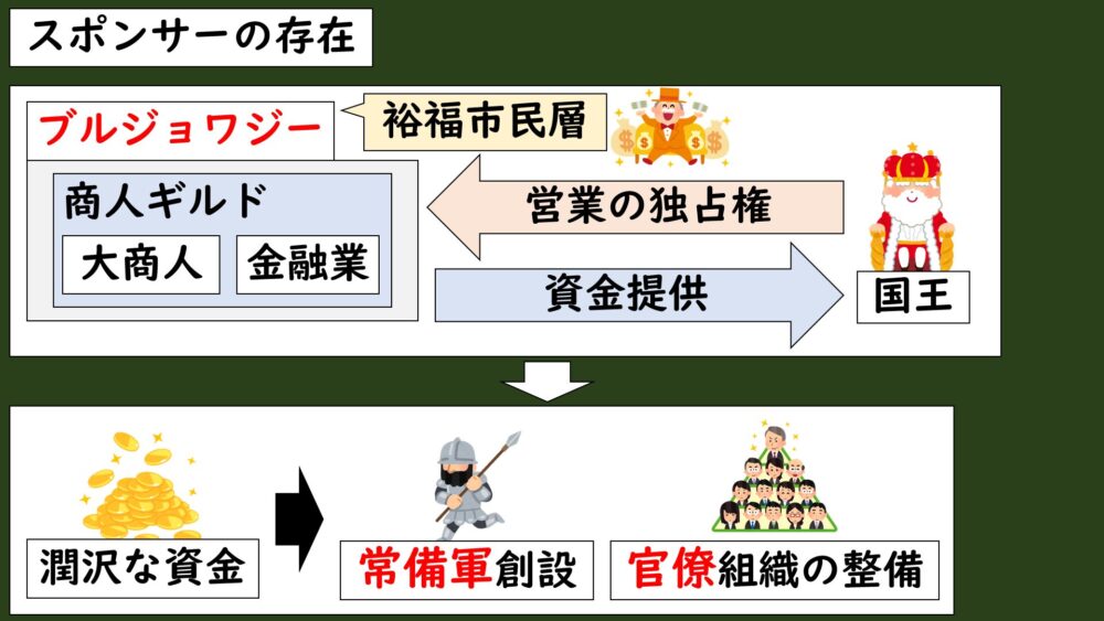 こうして国王は、新興勢力であるブルジョワジーをスポンサーに付けたことで、潤沢な資金力で、中央集権に必要な官僚組織と常備軍を整備・維持することができたんです。
