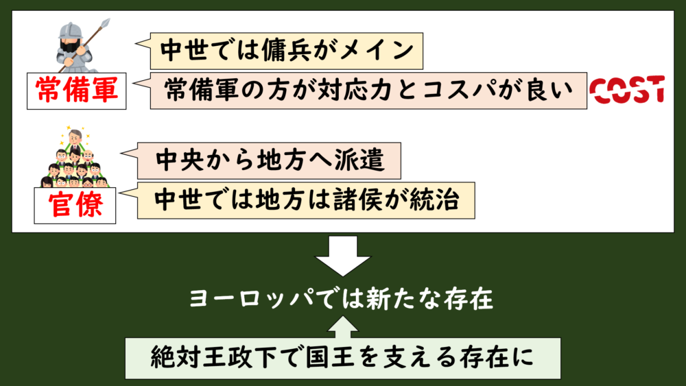 また、先ほどから出ていた常備軍や、中央から地方に派遣された官僚たちは、ヨーロッパでは新しい存在として、絶対王政を支えることになりました。