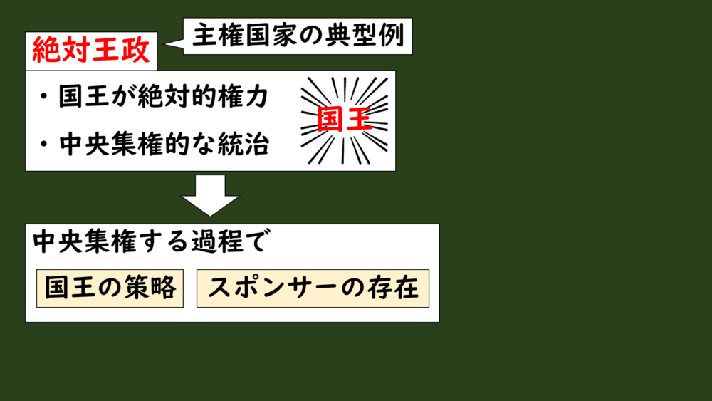 絶対王政とは、国王が絶対的な権力を握り、中央集権的な統治をする体制のことをいいます。