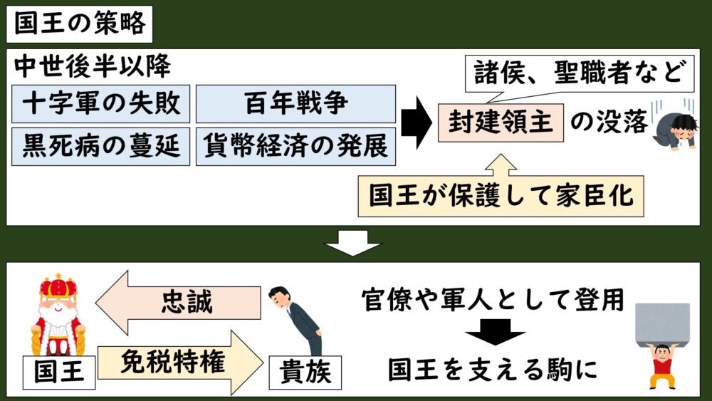 貴族や聖職者は、国王に忠誠を誓うことで免税特権などの恩恵を受けて保護してもらうことができ、官僚や軍人として登用されて、国王の統治を支える存在になっていきました。