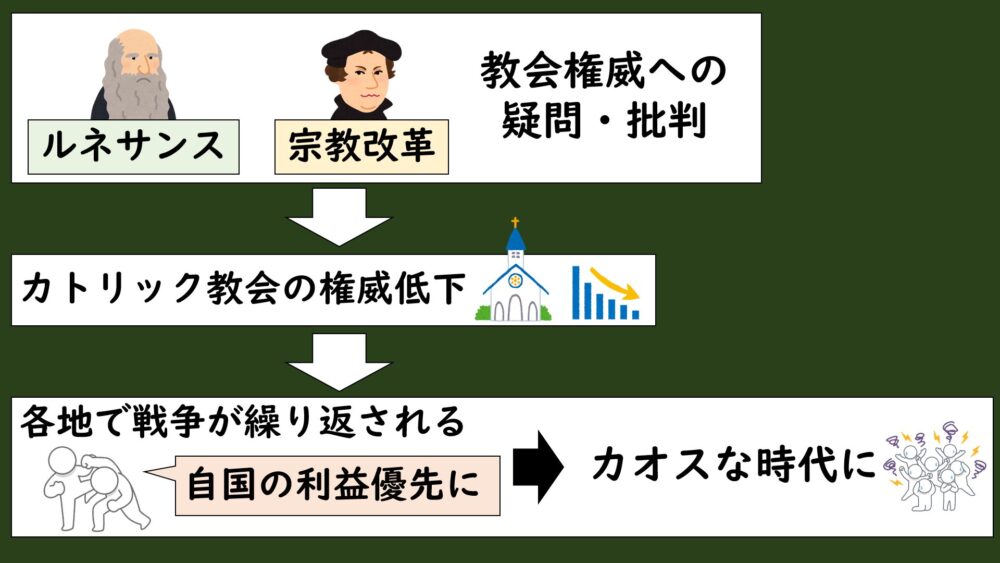 加えて、絶対的権威だったカトリック教会も、[7-3.2]教皇の権威低下での内容に加えて、ルネサンスや宗教改革など、カトリック教会の権威に疑問を持つような運動が起こったことで、さらにカトリック教会の権威が揺らいだ時期でもありました。