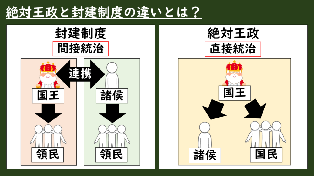 封建制度では、国王は各地の領主に支配を任せる「間接的支配」を行っていたが、絶対王政では官僚や常備軍を用いて国民を直接統治する「中央集権的支配」が目指された。