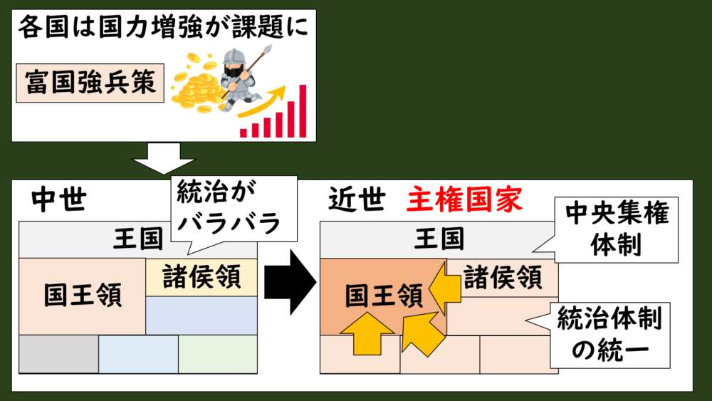 そうしたヨーロッパ各地で戦争が起こるようになったことで、ヨーロッパ諸国は群雄割拠を生き残るために、長期戦に耐えられる「富国強兵」をする必要に迫られました。