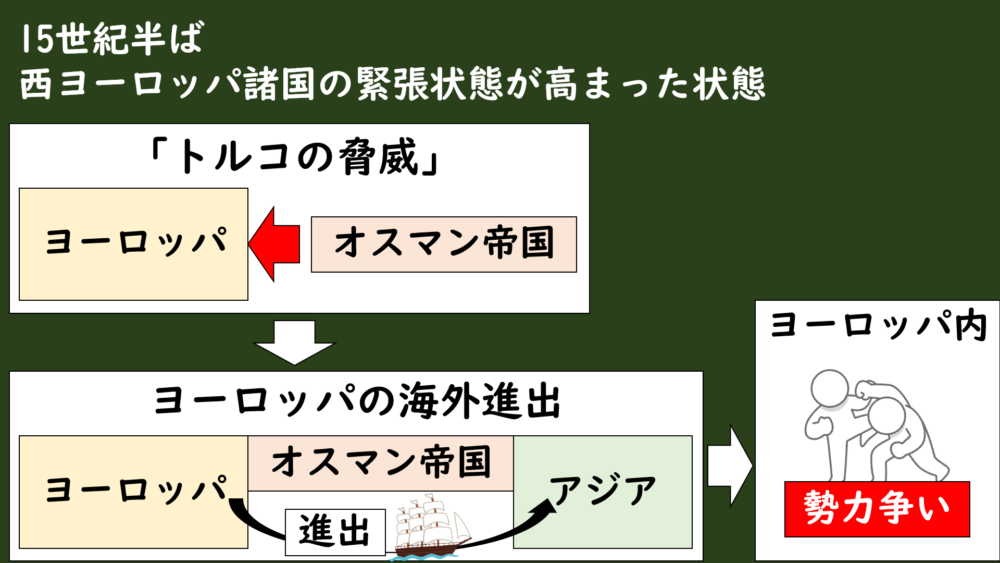 前回の[11-3.1]イタリア戦争で説明したように、近世(15世紀末~)に入ってからのヨーロッパでは、オスマン帝国の脅威が迫る中、海外進出が進み(大航海時代)、各国が勢力圏を競い合うようになりました。