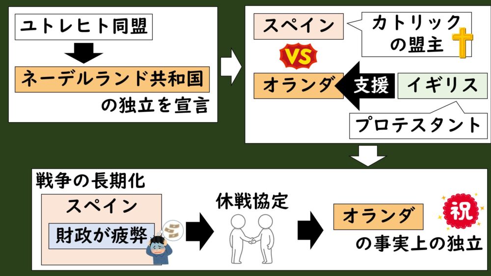 スペインにとって、経済的に発展しているオランダを失うことはダメージが大きかったので、オランダを奪還しようとしますが、イギリスの介入もあり、戦争は長期化してしまいます。