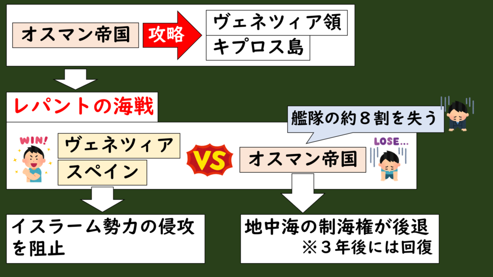 ここで注意してほしいのが、レパントの海戦によってオスマン帝国はその後も地中海の制海権を失ったわけではなく、3年後には海軍を再建して地中海の制海権を回復させているんです。
