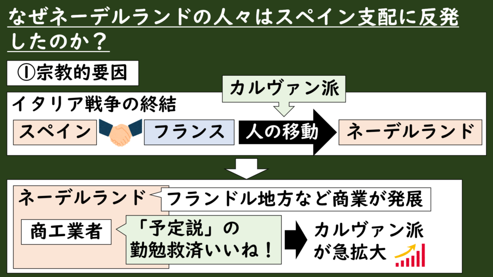 なので、商工業者にとって、カルヴァンの「規律と勤勉を守る者が神に救済される条件」である予定説は、魅力的に感じられて、カルヴァン派はネーデルランドで急速に広がっていくことになりました。