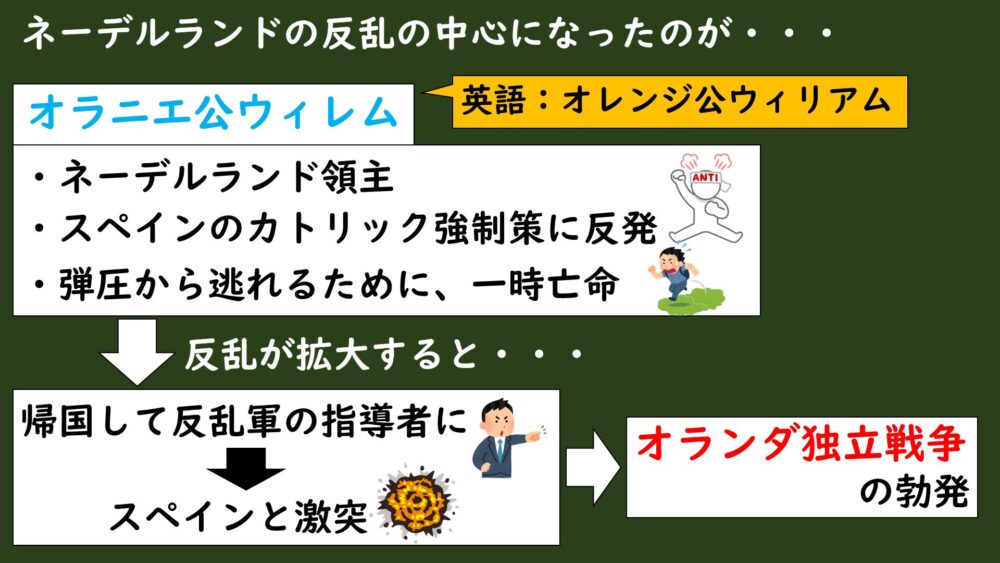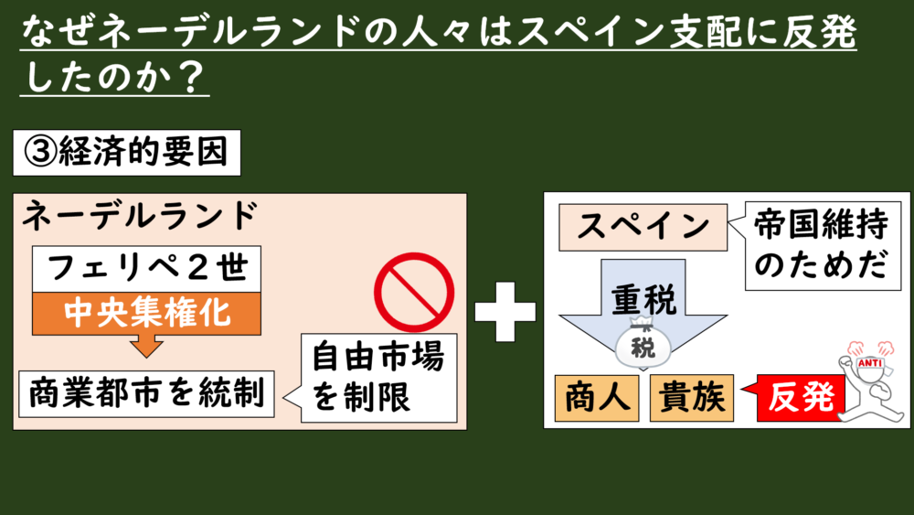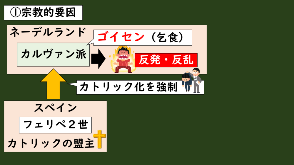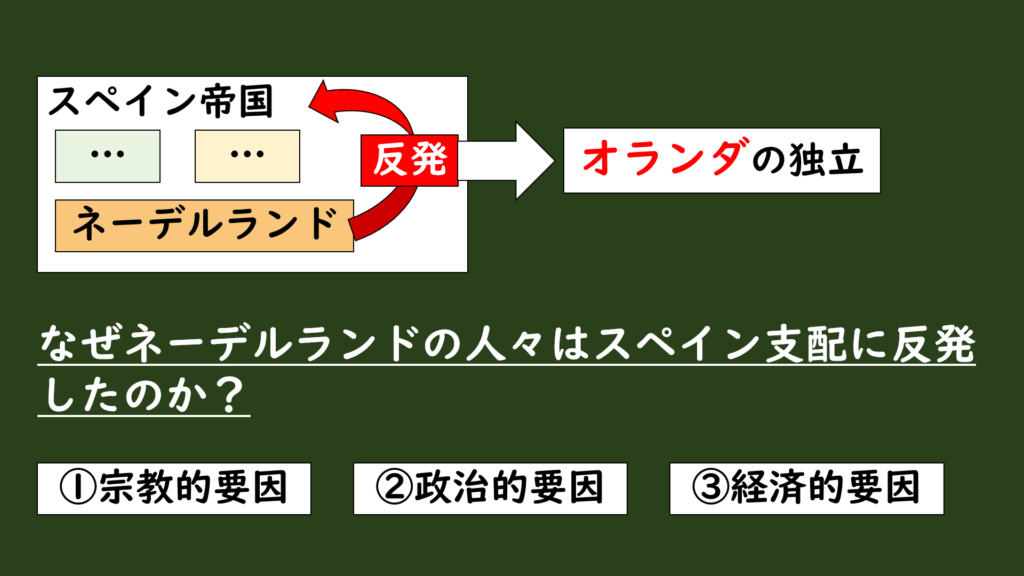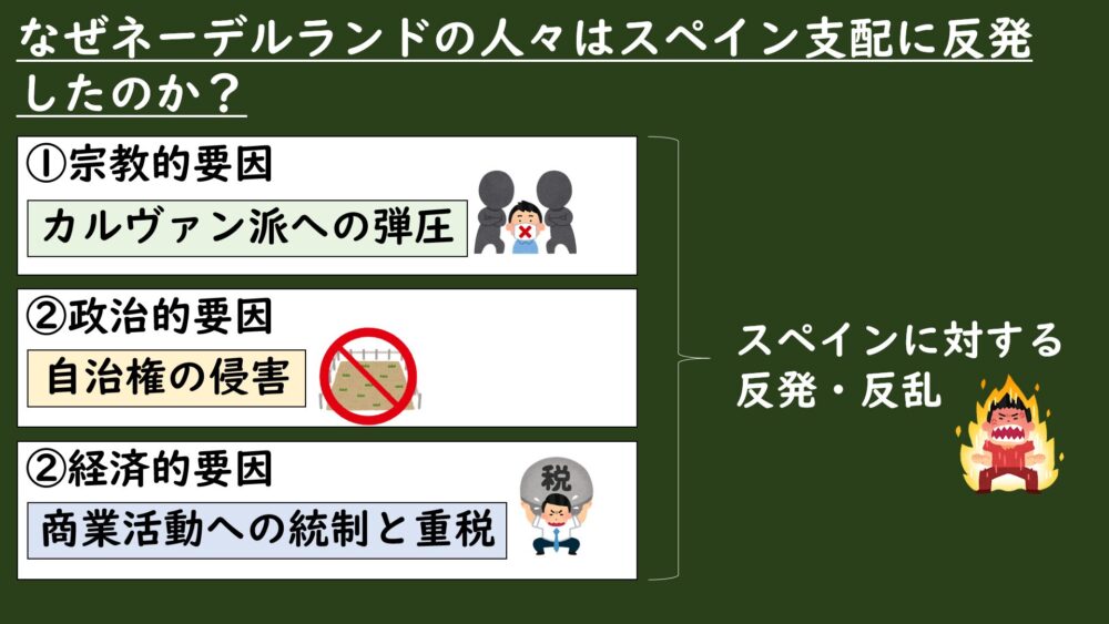 これら①~③の要因が重なったことで、ネーデルランドではスペイン支配に対して強く反発するようになって、反乱が起こるようになっていったんです。