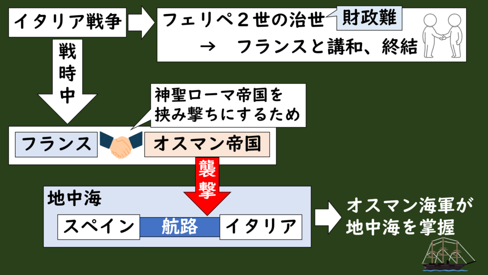 イタリア戦争が終結した後も、オスマン海軍が地中海の制海権を手放さなかったので、スペインはこれを脅威に感じます。