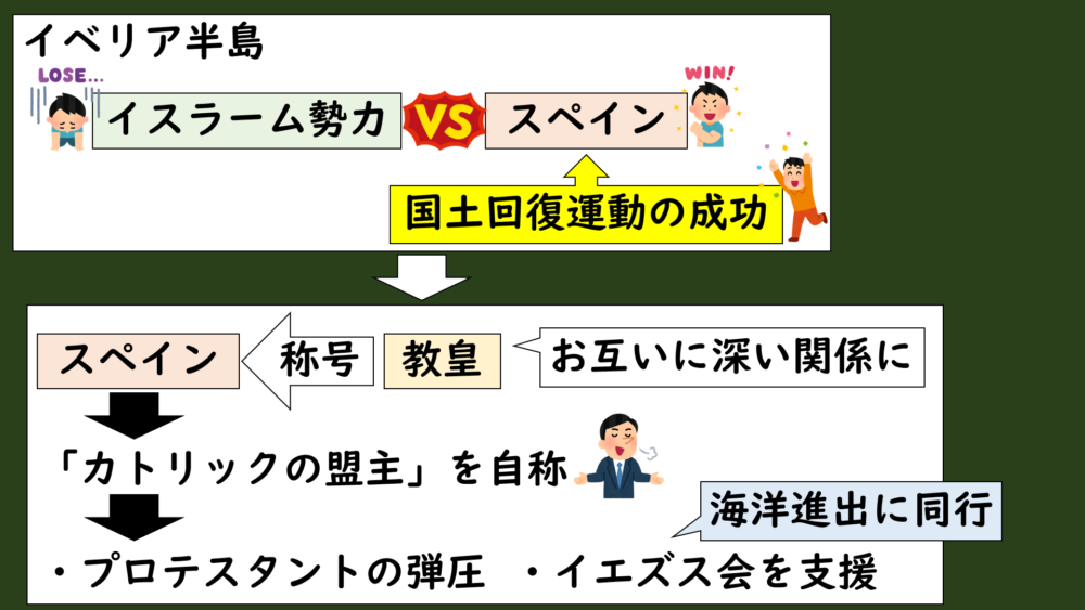 スペインは以前から、国土回復運動(レコンキスタ)を成功させたことで、キリスト教の守護者として教皇から称号を授与されて、カトリック教会とは深い関係を築いていました。