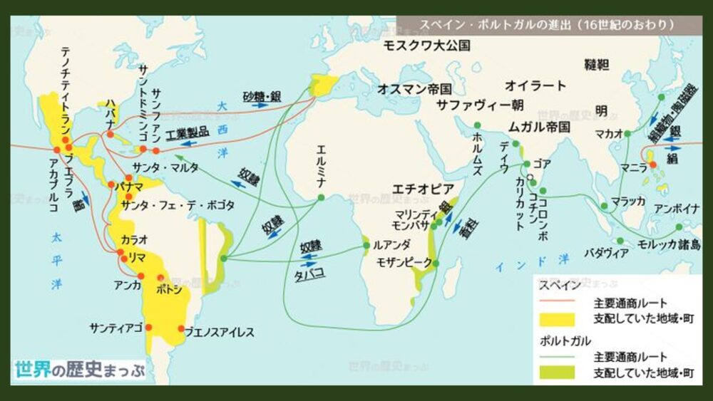 加えて、以前からおこなわれていた海洋進出によって、アジアではフィリピンのマニラ、アメリカ大陸では中南米にかけて、広大な植民地を獲得していました。