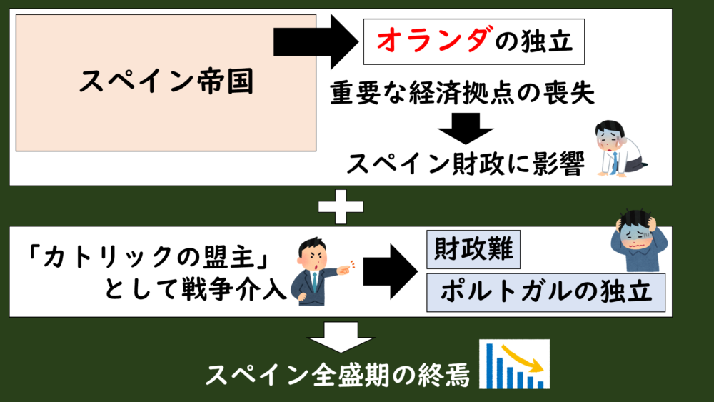 ポルトガルとの同君連合も解消されてしまったことで、スペインはいよいよ衰退していくことになり、国力は急速に失われていき、全盛期は終焉を迎えることになりました。